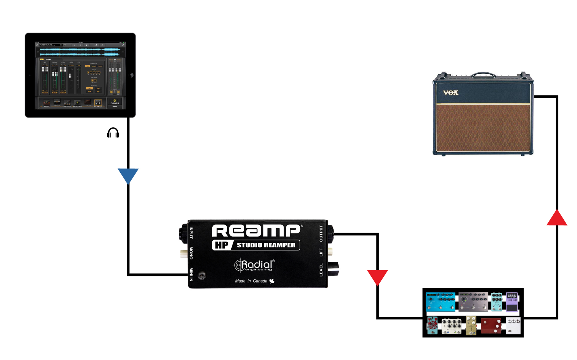 The Reamp® HP takes the signal from a headphone output jack on an audio interface or a mobile device and converts it to feed mono guitar amps and effects pedals for Reamping.