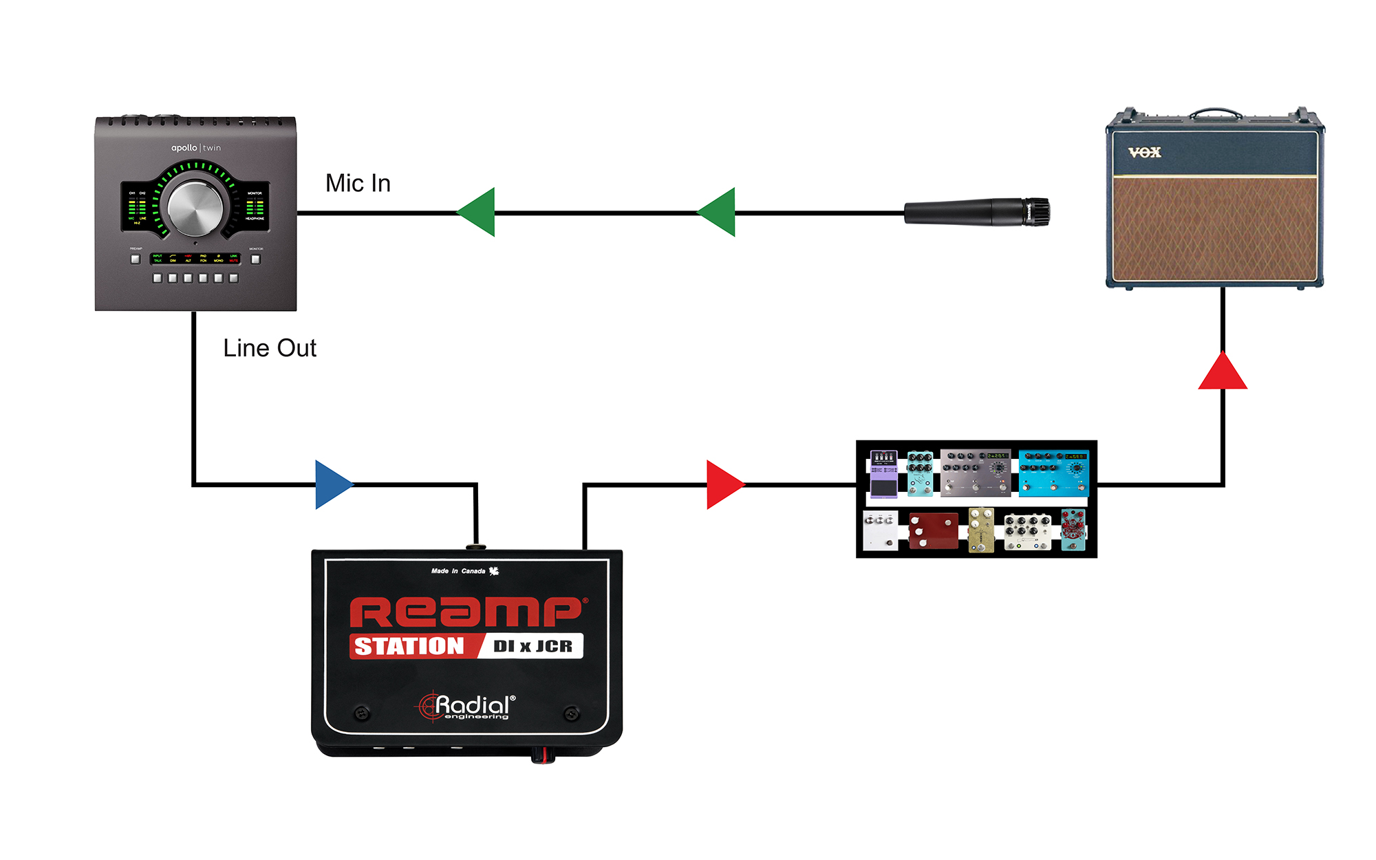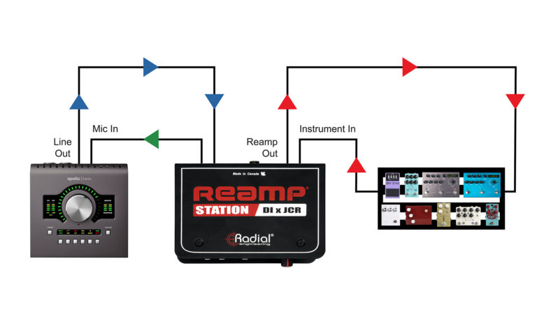 With the Reamp® Station, you can play any recorded track back through your effects pedals as if they were a piece of studio hardware. Send the Reamped signal out to your pedals as normal, but skip the amplifier and connect back into the Reamp® Station’s instrument input. The direct box output feeds a mic-level signal back to your interface to record the results.